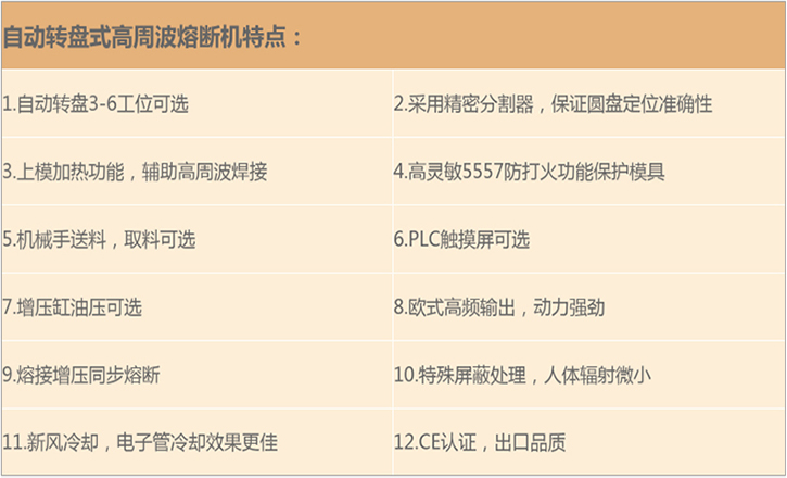 針對需要高周波熔接+同步裁斷的產(chǎn)品加工, 適用于APET、PETG、GAG環(huán)保材質(zhì)的雙面吸塑泡殼的封口包裝、吸塑紙卡包裝、牙刷封口包裝,以EVA布類皮革、真皮、OPP、PU材質(zhì)的熔接及熔斷, 也可用于APET、PETG、PVC、PP片材的柔軟線(SK線)生產(chǎn)。