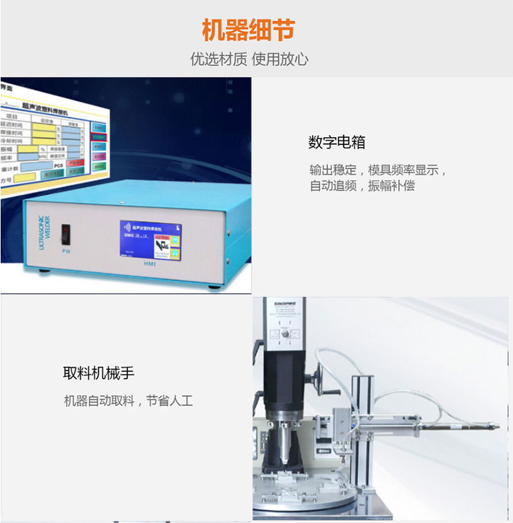 超聲波塑膠焊接機(jī)適合于適ABS、PE、PC、PS、PVC、PP、ABS和PC合成物、亞克力等塑膠材料的超聲波焊接。如:手機(jī)外殼、電池殼、充電器、U盤,SD卡,CF卡,USB接插件、文件夾等產(chǎn)品焊接。