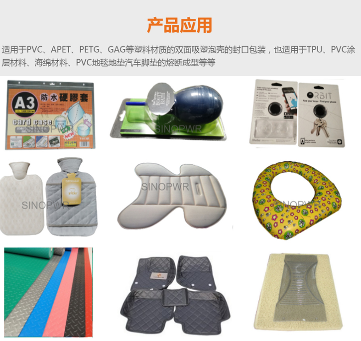 針對(duì)需要高周波熔接同時(shí)又必須同步裁斷的產(chǎn)品加工, 主要適用于APET、PETG、GAG環(huán)保材質(zhì)的雙面吸塑泡殼的封口包裝、吸塑紙卡包裝、牙刷封口包裝,以EVA布類皮革、真皮、OPP、PU材質(zhì)的熔接及熔斷, 也可以用于APET、PETG、PVC、PP片材的柔軟線(SK線)生產(chǎn)。