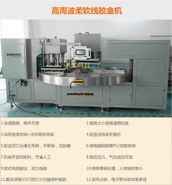 自動(dòng)轉(zhuǎn)盤(pán)式高周波熔接機(jī)常用于pvc、PETG雙面吸塑泡殼封口包裝,吸塑吊卡封口包裝,雙面紙卡夾吸塑罩熱合封口包裝,等吸塑自動(dòng)化包裝。